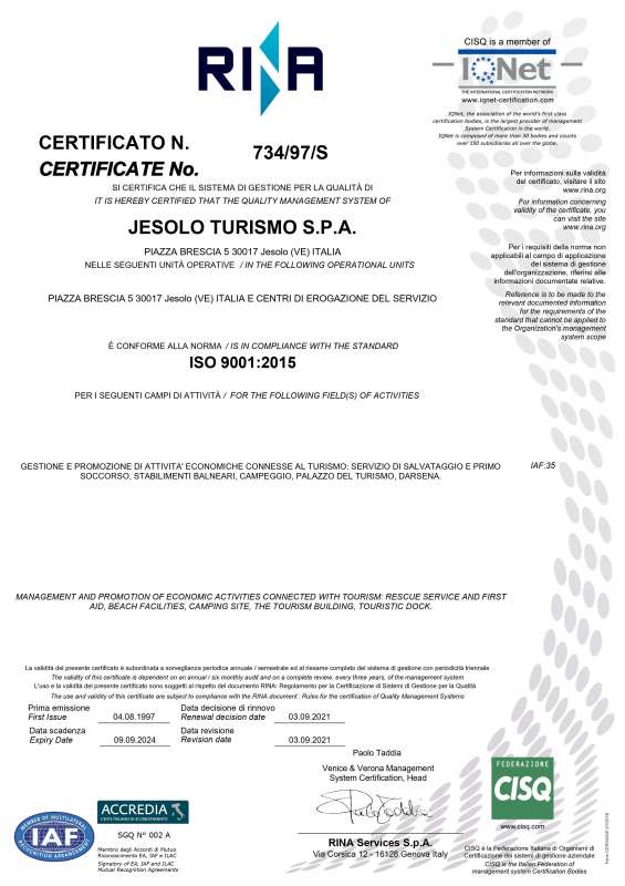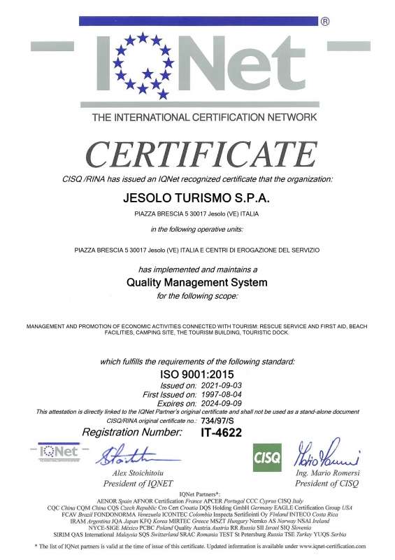 Jesolo Turismo è stata la prima società italiana del comparto turistico a ricevere una certificazione internazionale di qualità (UNI EN ISO 9002) fin dal 1997.